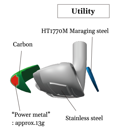 Conventional clubs experience head vibrations at impact, sapping energy that needs to be applied to the ball. With clubs adopting the “Dual Impact Theory,” the “power metal” attached at the back of the head pushes out the carbon component, curbing surplus vibration at impact. Another benefit is synchronization of head and ball deformation, for improved drive distance without squandering energy.
