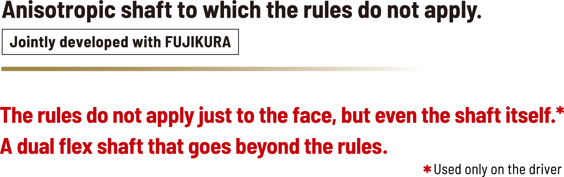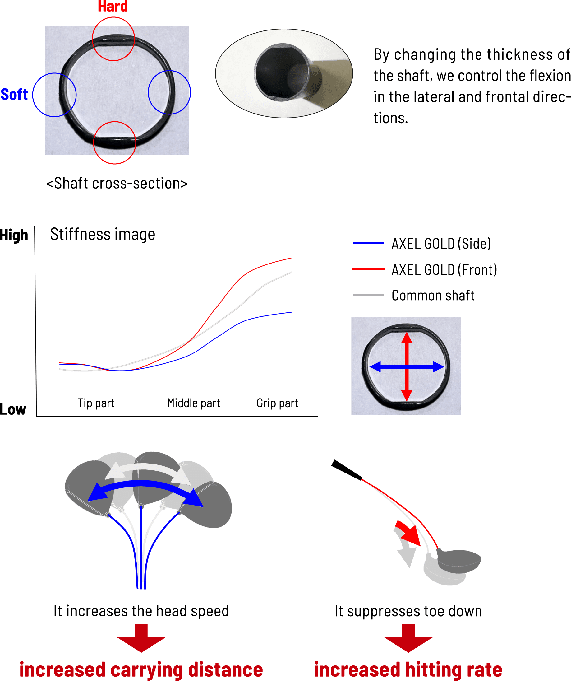 There is a rule about how the shaft flexes that says “It must flex the same way in all directions.” However, this dual flex shaft changes the thickness (rigidity) of the shaft in the lateral and frontal directions, achieving an increase in the head speed while improving the hitting rate.