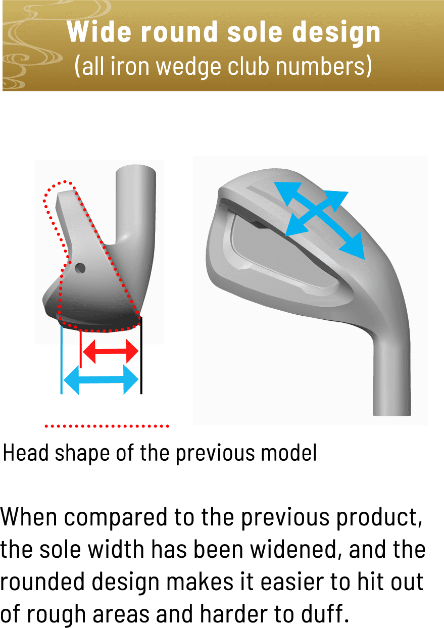 “Wide round sole design” with a wider sole width and stronger roundness for all club numbers. It has a low center of gravity and the sole is easy to hit out of rough areas, and the ball naturally rises higher without being hit strongly. In addition, the square-channel design on all club numbers provides a stable spin even with a small amount of force, allowing you to aim for the green with a high trajectory. The hollow interior is filled with microurethane foam to suppress excess vibration and provide a comfortable impact feel when hitting the ball.